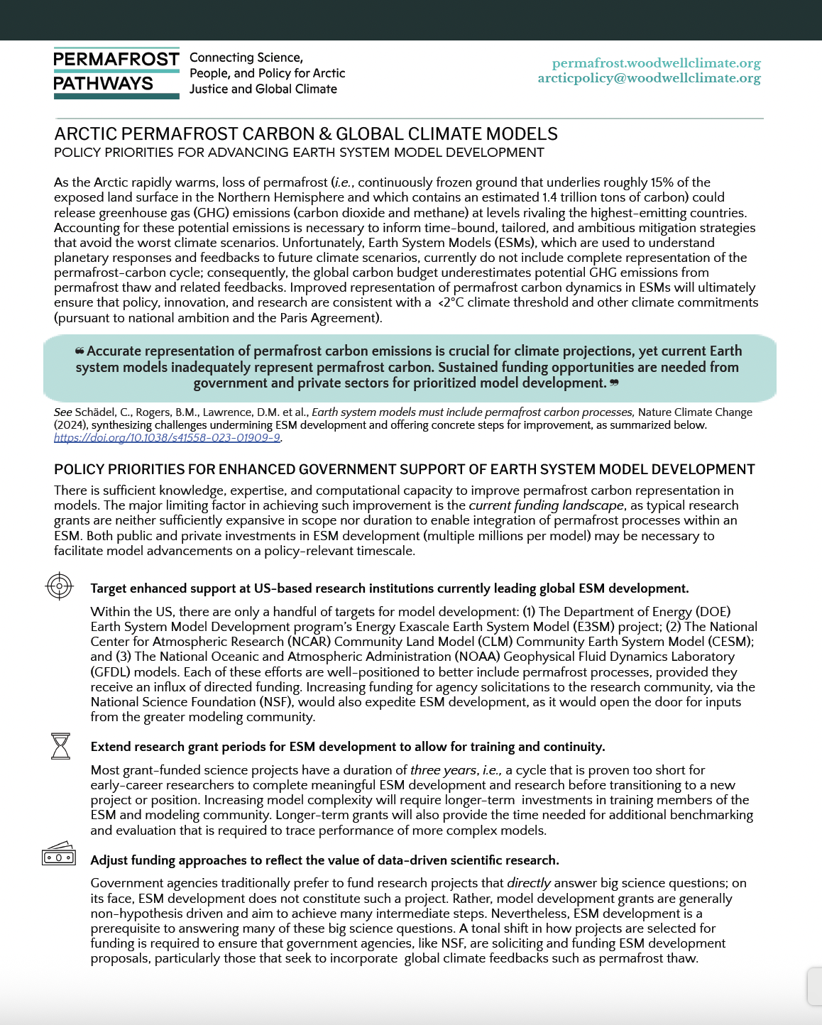 As the Arctic rapidly warms, loss of permafrost (i.e., continuously frozen ground that underlies roughly 15% of the exposed land surface in the Northern Hemisphere and which contains an estimated 1.4 trillion tons of carbon) could release greenhouse gas (GHG) emissions (carbon dioxide and methane) at levels rivaling the highest-emitting countries. Accounting for these potential emissions is necessary to inform time-bound, tailored, and ambitious mitigation strategies that avoid the worst climate scenarios. Unfortunately, Earth System Models (ESMs), which are used to understand planetary responses and feedbacks to future climate scenarios, currently do not include complete representation of the permafrost-carbon cycle; consequently, the global carbon budget underestimates potential GHG emissions from permafrost thaw and related feedbacks. Improved representation of permafrost carbon dynamics in ESMs will ultimately ensure that policy, innovation, and research are consistent with a <2°C climate threshold and other climate commitments (pursuant to national ambition and the Paris Agreement).